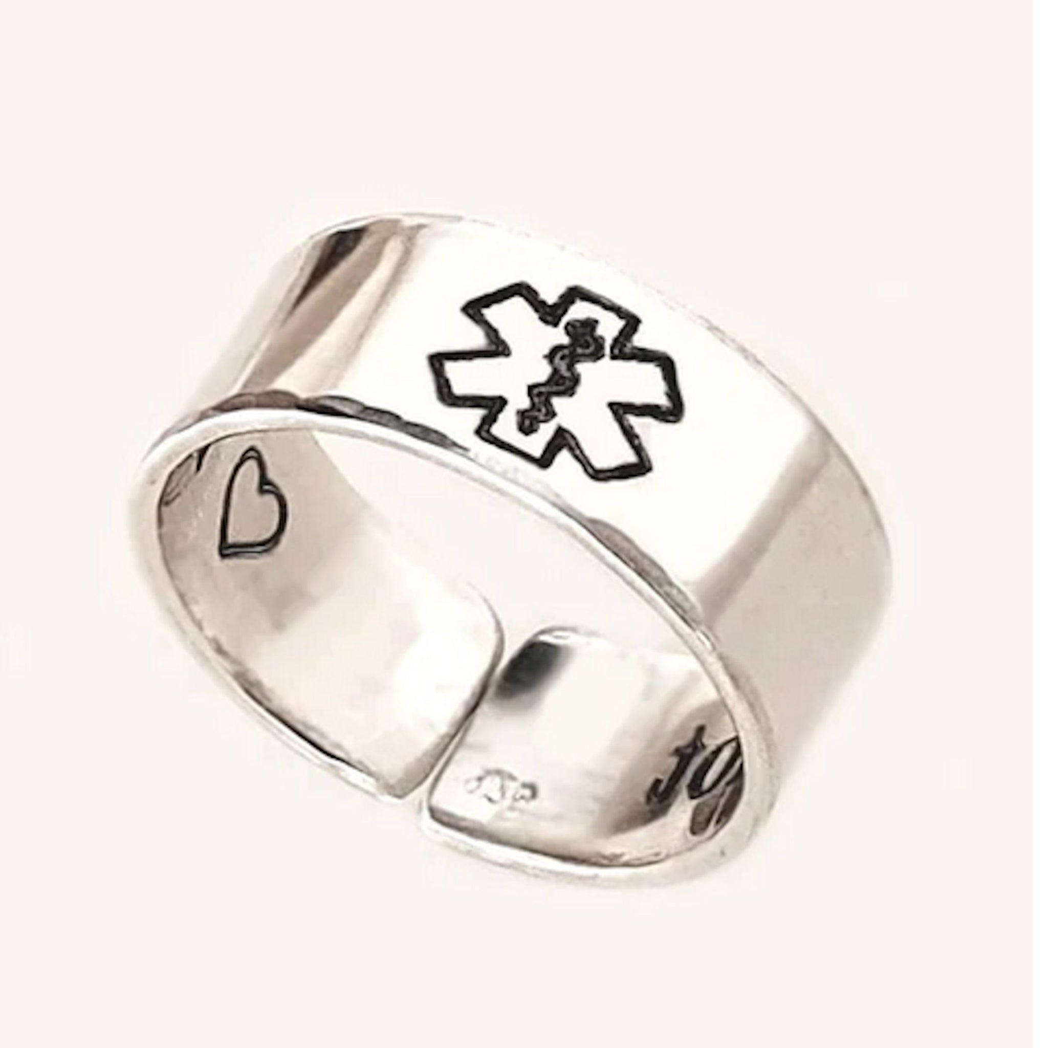 This ring can be personalized with essential medical or emergency information, making it not only a tribute to the medical field but also a practical medical alert accessory.